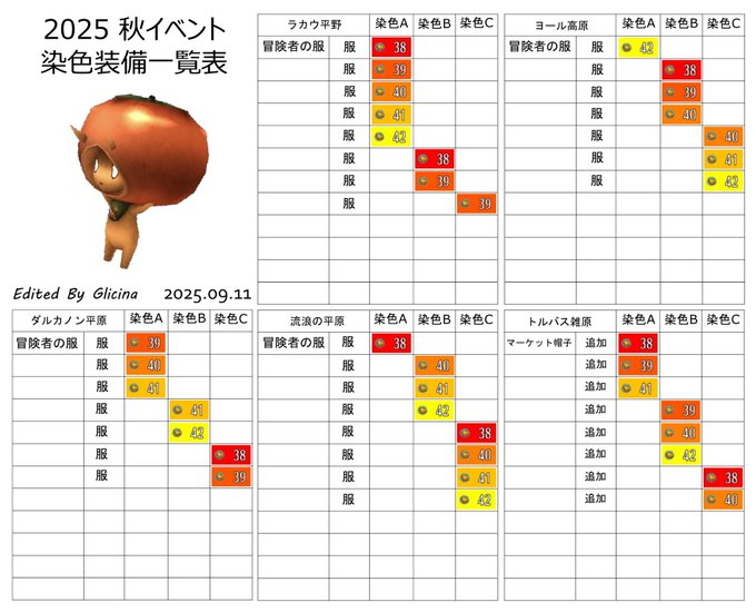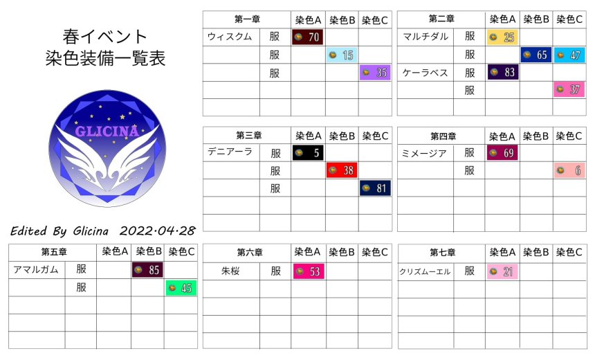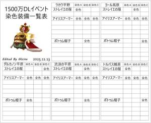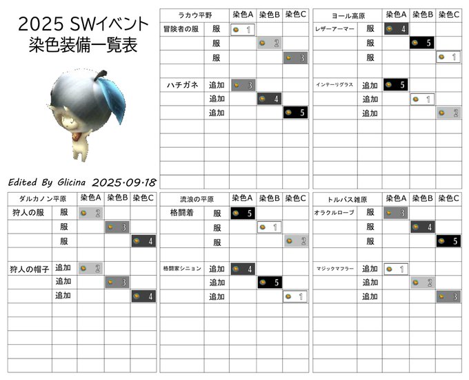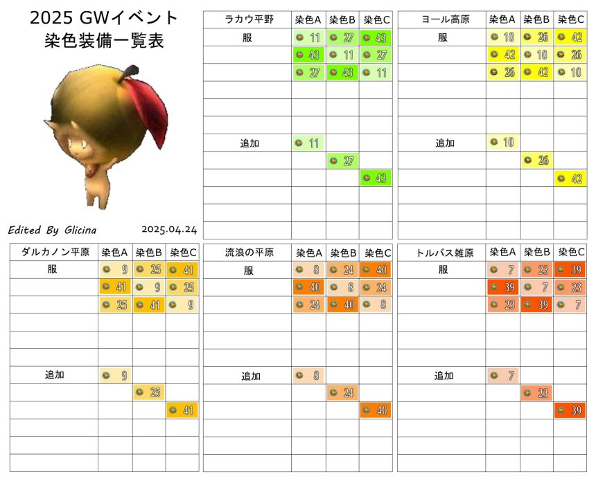目次 染色装備一覧表(イベント) 春イベント GWイベント 秋の味覚イベント SWイベント 1500万DLイベント 染色装備一覧表(イベント) クリックで大判になります 春イベント 2025 GWイベント 2025 秋の味覚イベント 2025 SWイベント 2025 1500万DLイベント Glicina 最終更新: 2026-02-15