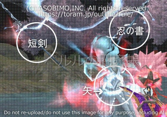 | ・銘酒「珠桜」(各種装備ほか素材) ・破れた折り鶴 ・邪気を帯びた折り紙 ・縹色の葛籠 |