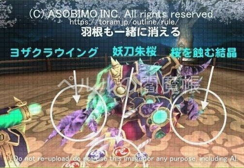 | ・桜花水晶(サクラキモノ参ほか素材) ・湿った桜の枝 ・桜を蝕む黒羽根 ※会話ランダム報酬 ・桜色の水晶片・折れた桜の枝・砕けた夜桜の木 ・湿った桜の枝・ケーラベスの牙・桜を蝕む黒羽根 |